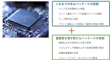 新たなニーズに応えるため、多種多様なパッケージ技術が次々と開発されています。近年では、パッケージ内配線や封止剤、放熱部材、チップ間やプリント基板との間の接続端子などに新材料や新構造を導入する例が相次いでいます。ここからは、こうした中で、半導体チップの価値向上に特に大きな影響を及ぼす可能性のある2つの技術にフォーカスして、技術開発の動向とチップの進化に与えるインパクトを解説します。