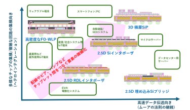 こうした背景から、微細化以外の半導体チップの性能や価値を高めるための機軸として、さらには微細化に伴う課題を解消する手段として、伸び代が残るパッケージなど後工程での技術革新に期待がかけられているのです。