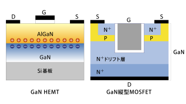 図2 GaNデバイスで採用されているGaN HEMTの構造と、将来市場投入される可能性のあるGaN縦型MOSFET(トレンチ型)の構造