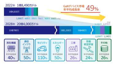 図4 GaNデバイスの市場は、2022年から2028年の間に年率49%のペースで急成長