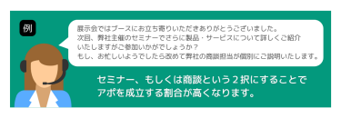 キャッチは製品に詳しくないアルバイトが多い為、一言で製品のいいところを説明できるスクリプトが必要。来場者は様々なブースを回りたいので「この製品はなに?」と聞かれるケース多いからです。見込みがあれば3分バージョンの説明か、パンフレットを渡します。見込みがあるかないかを判断するためにスピードも重要なので、一言VERと、次3分VERとフィルタをかけます。