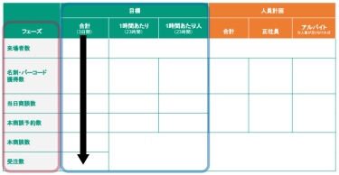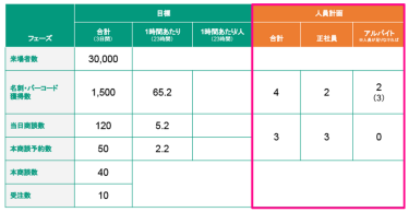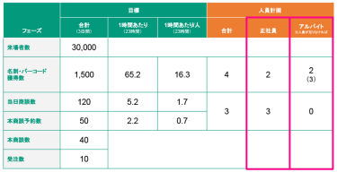目標を遂行するための人員を想定します。製品・サービスの知識があり的確に答えられる社員で対応するのが理想ですが足りない場合はアルバイトを採用しましょう。しかし、アルバイトは知識やモチベが社員に比べて低いためブース前で来場者に声掛けし興味関心をもってもらい、正社員にパスする役目がよいでしょう。