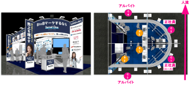 目的・目標がきまったらそれを遂行する人員をブースのどこに配置するか落とし込むことが大切です。人流を意識し、バイネームで決めましょう。