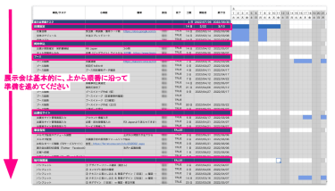 事前準備には下記のようなガントチャートが便利です。まずは目的、目標設定、人員配置、、、と上から順番に沿って準備をすすめていきましょう。