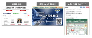 事前の出展製品検索(会期3か月前から)登録、自社社内にあるデータに向けた招待券やメール配信、自社サイトやプレスリリースで出展の告知を行うことで会期当日のブース集客に繋がります。