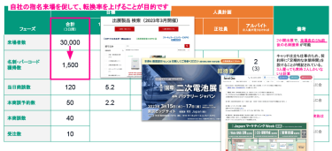 自社を知っている「指名来場」を促すことで意図的に転換率をあげられるからです。社内にあるデータやリリースで告知すること、どの製品を出展するか事前に知ってもらうことで高確率でブースに来てもらうことができます。当日、「貴社ブースを目的に、製品を見に来ました」という貴社目当ての指名来場が増えれば、その先効率よく商談に進められます。