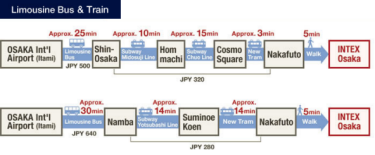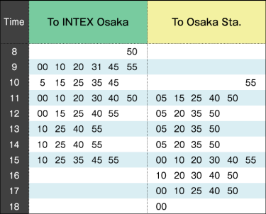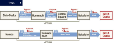 During the show period, Show Management runs a shuttle bus from JR Osaka Station to INTEX Osaka (No transfer needed).