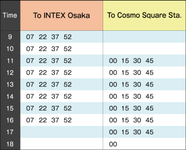 Loop bus from Cosmo Square Sta. to INTEX Osaka (Approx. 5 min)
